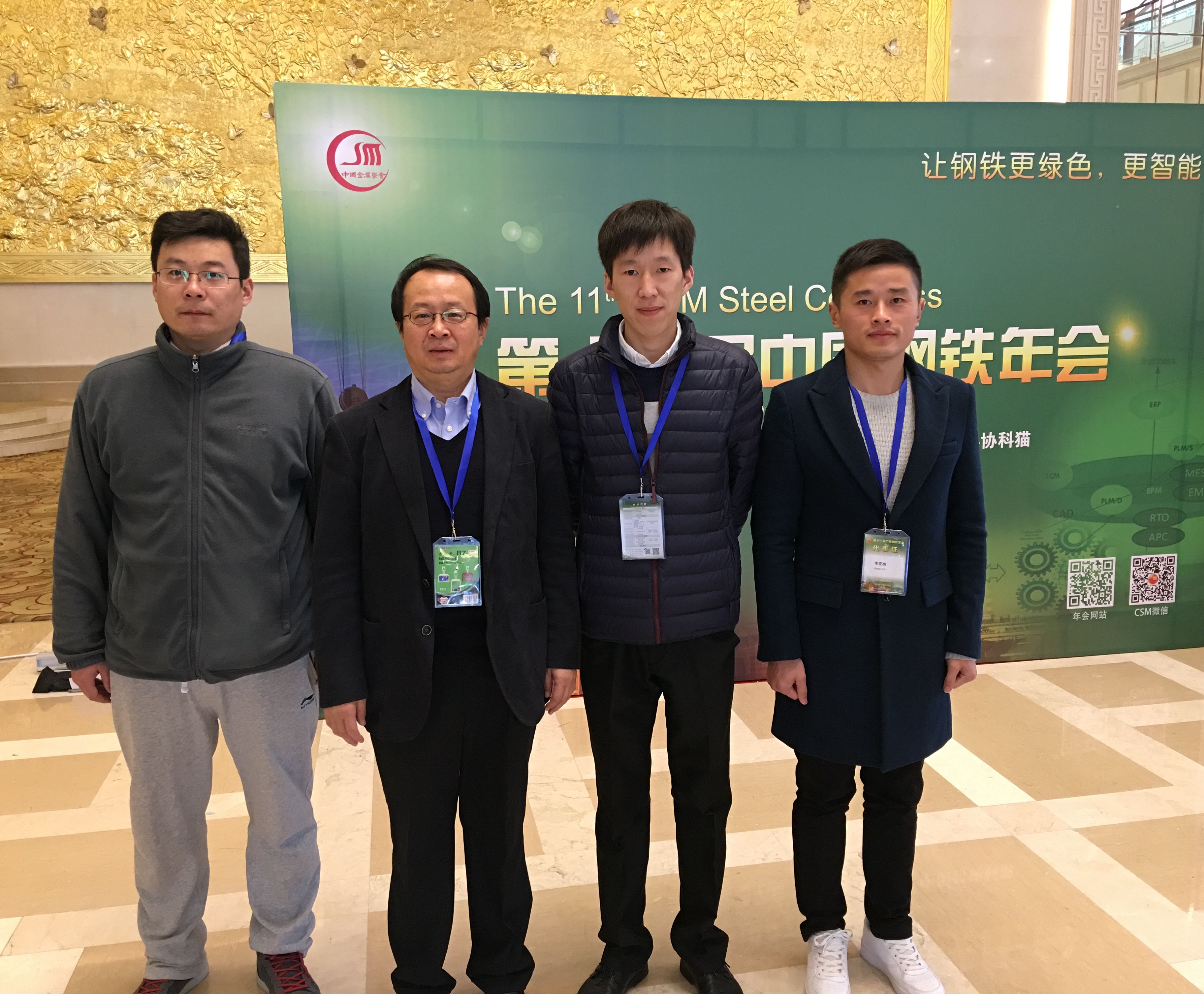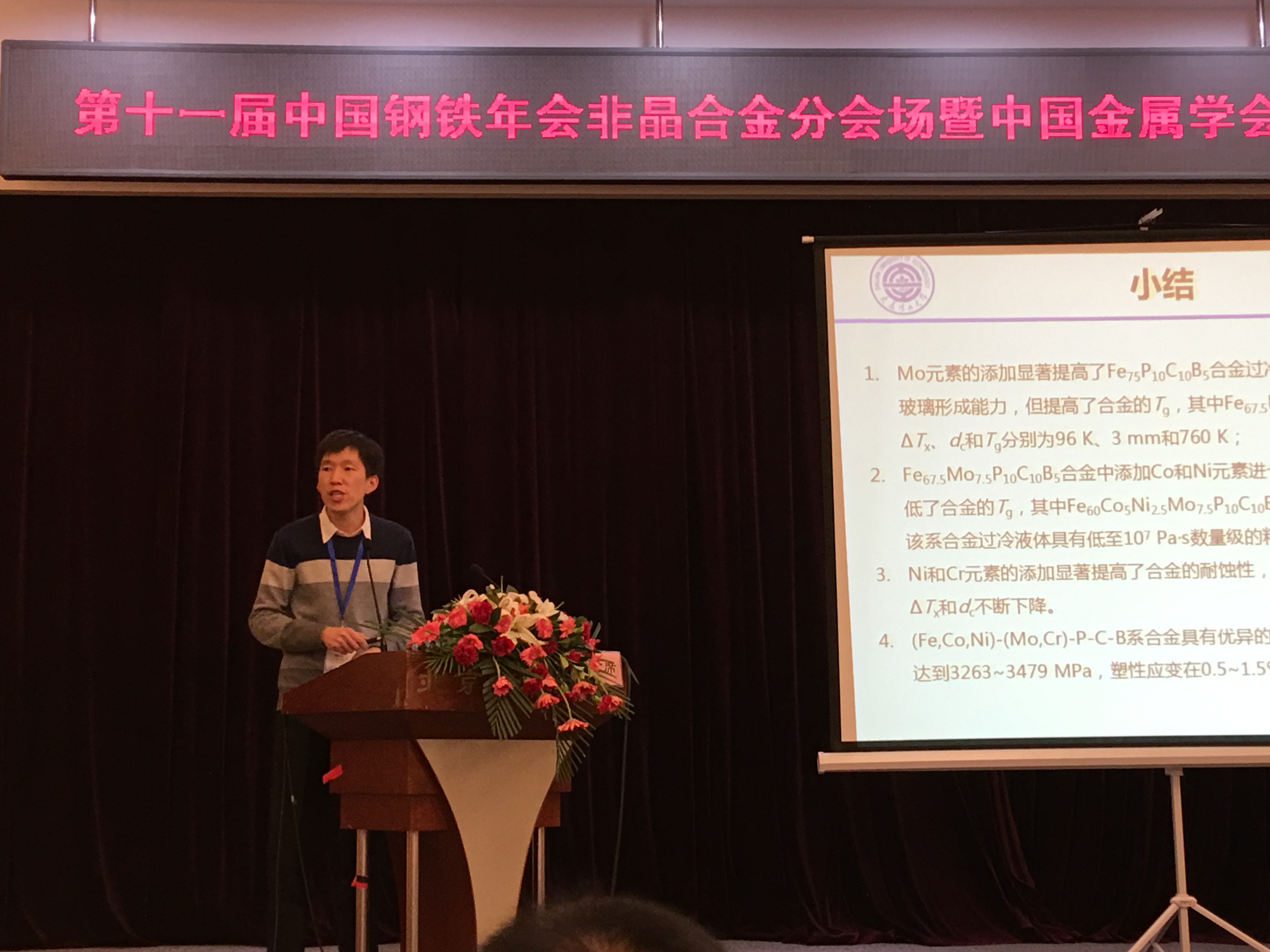 2017年11月21-22日,第十一届中国钢铁年会在北京会议中心隆重召开,课题组张伟教授带领我组博士生马殿国、贾行杰和硕士生李亚楠参加了本次年会的非晶合金分会。马殿国同学的《Fe-Pt-B非晶合金脱合金化制备Pt基纳米多孔材料及其性能研究》的墙报获得分会优秀墙报一等奖。贾行杰同学被选为优秀论文作者,发表了题为《合金元素添加对Fe-P-C-B系非晶合金玻璃形成能力和耐蚀性的影响》的口头报告。