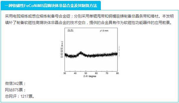 近日,由《非晶中国》与《材料人》联合举办了“第二届 '兆晶杯' 2015年度中国非晶材料十大进展”活动。经过两轮评选,本研究室申请的发明专利:一种软磁性FeCoNiMB高熵块体非晶合金及其制备方法(张伟,齐天龙,李艳辉,申请号:CN201510293400)最终成功入围2015年度中国非晶材料十大进展。该发明专利源自本实验室近年来有关软磁性高熵块体非晶合金的研究成果,填补了制备软磁性高熵块体非晶合金的技术空白,提供的合金具有作为软磁性功能器件的功能前景。相关成果还发表在《Intermetallics, 66 (2015): 8-12》和《Journal of Alloys and Compounds, 693 (2017): 25-31》杂志上。